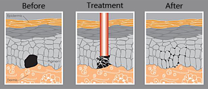 獨特的1064nm波長穿透真皮層,利用專一性的光熱效應,擊碎麥拉寧聚集的黑色素團塊,促使麥拉寧吞噬細胞加速吸收代謝頑固的黑色素並排出體外,讓皮膚驅黑淨白,遠離黝黑暗沉。